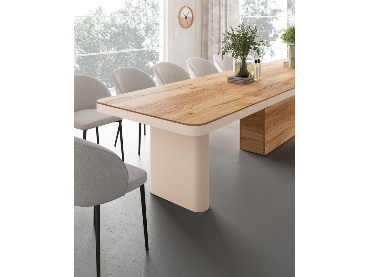 Je to najväčší stôl dostupný na trhu, vysoký lesk , matný alebo v drevo dekore, ideálny pre rodinné aj obchodné stretnutia. Stelesňuje moderný dizajn,variabilitu a funkčnosť veľmi kvalitného nábytku. Oválna, zaoblená doska mu nielen dodáva elegantný a ľahký pocit, ale tiež uľahčuje pohodlnú interakciu medzi všetkými sediacimi.