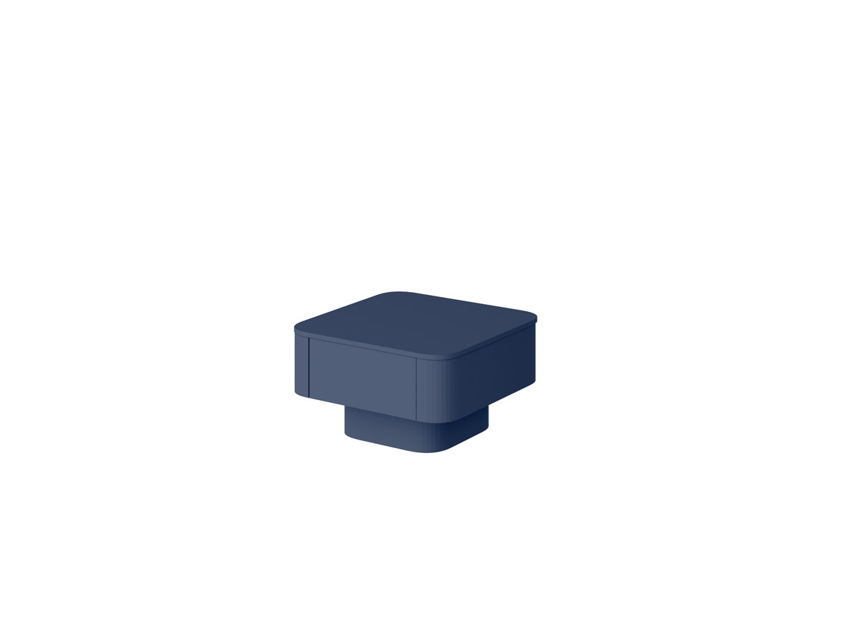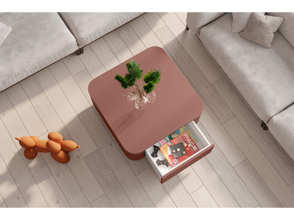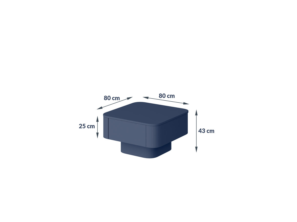 Základňa konferenčného stolíka je menšia, zaoblená štvorcová, ktorá vytvára vizuálny efekt pripomínajúci dva na sebe naskladané bloky. Tento dizajn vytvára pocit stability a zároveň zdôrazňuje ľahkosť formy. Horná časť sa zdá byť mierne nad základňou, čo dodáva celému konferenčnému stolíku dynamický a sochársky charakter a robí z neho malé umelecké dielo v obývačke.