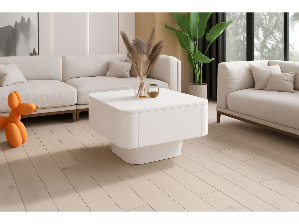 Základňa konferenčného stolíka je menšia, zaoblená štvorcová, ktorá vytvára vizuálny efekt pripomínajúci dva na sebe naskladané bloky. Tento dizajn vytvára pocit stability a zároveň zdôrazňuje ľahkosť formy. Horná časť sa zdá byť mierne nad základňou, čo dodáva celému konferenčnému stolíku dynamický a sochársky charakter a robí z neho malé umelecké dielo v obývačke.