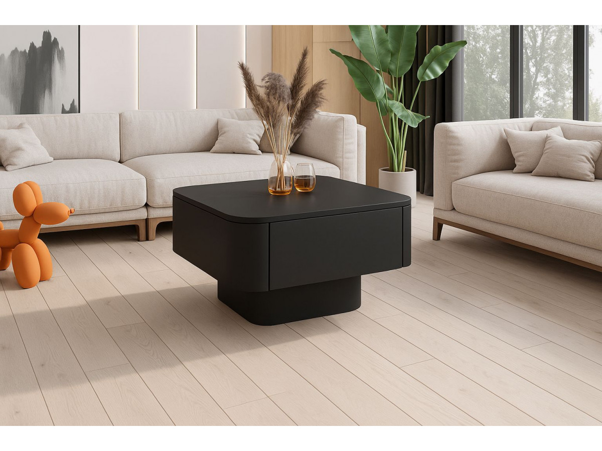 Základňa konferenčného stolíka je menšia, zaoblená štvorcová, ktorá vytvára vizuálny efekt pripomínajúci dva na sebe naskladané bloky. Tento dizajn vytvára pocit stability a zároveň zdôrazňuje ľahkosť formy. Horná časť sa zdá byť mierne nad základňou, čo dodáva celému konferenčnému stolíku dynamický a sochársky charakter a robí z neho malé umelecké dielo v obývačke.