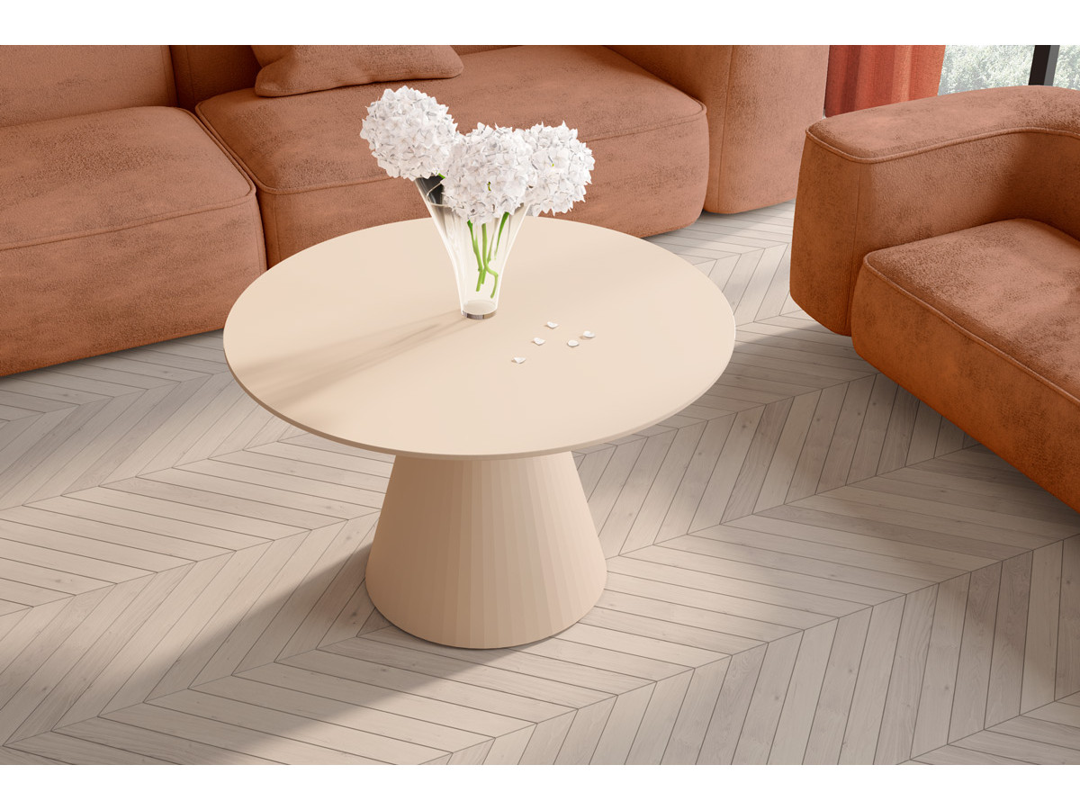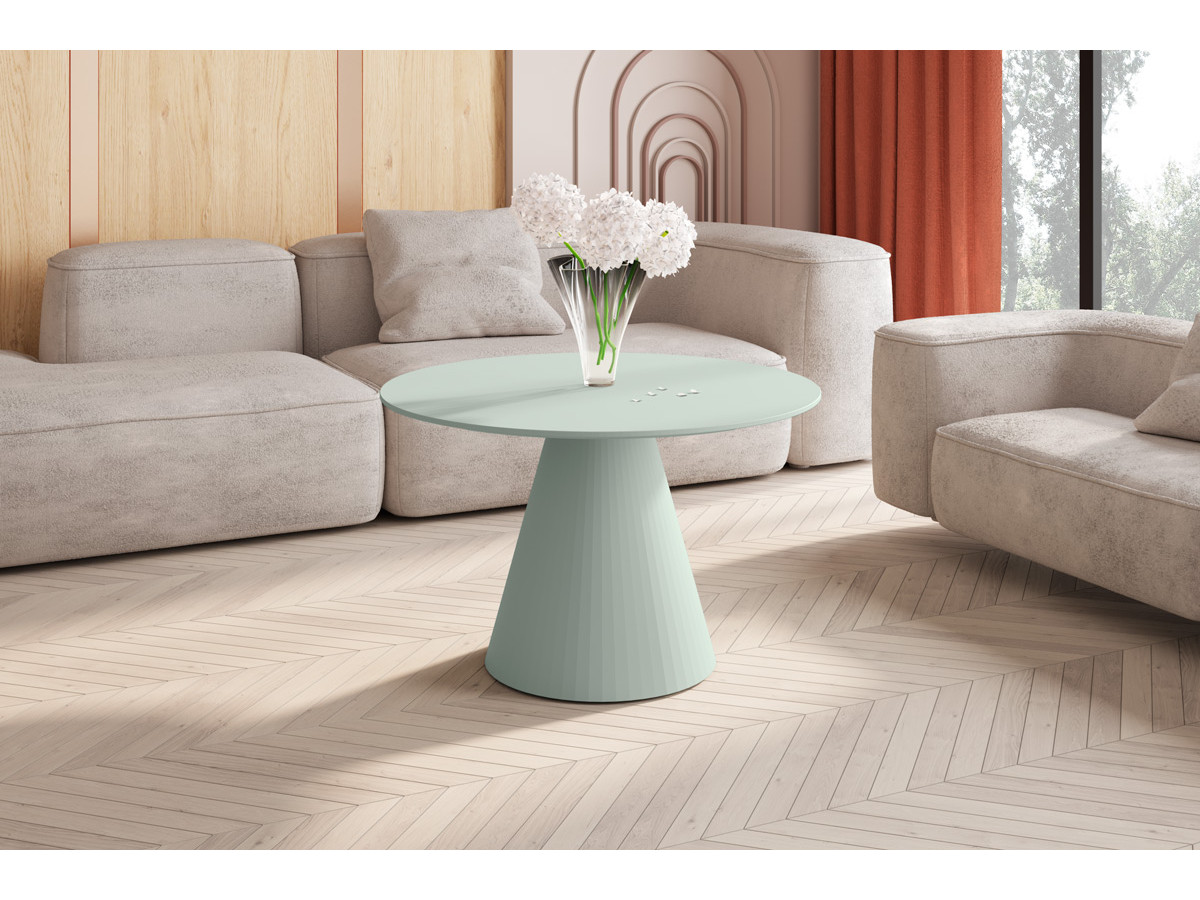 Konferenčný stolík PINETO MINI z kolekcie Amore Colore je jedinečný kus nábytku, ktorý priťahuje pozornosť svojím jedinečným dizajnom. Vyznačuje sa najtrendovejšou okrúhlou doskou tejto sezóny, ktorá symbolizuje eleganciu a harmóniu, zatiaľ čo jeho hladký matný povrch zdôrazňuje jemnú súhru svetla a farby. Zaujímavím prvkom a určujúcim znakom celej kolekcie Amore Colore, popri krásnych pastelových farbách, je nezvyčajne zaoblená, kužeľovitá noha s výraznou štruktúrou jemných pruhov na matnom povrchu.