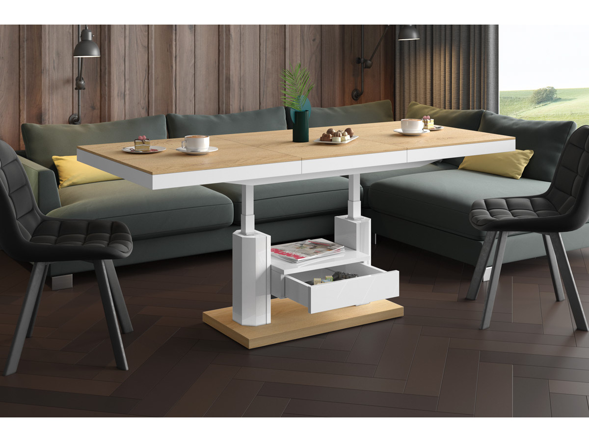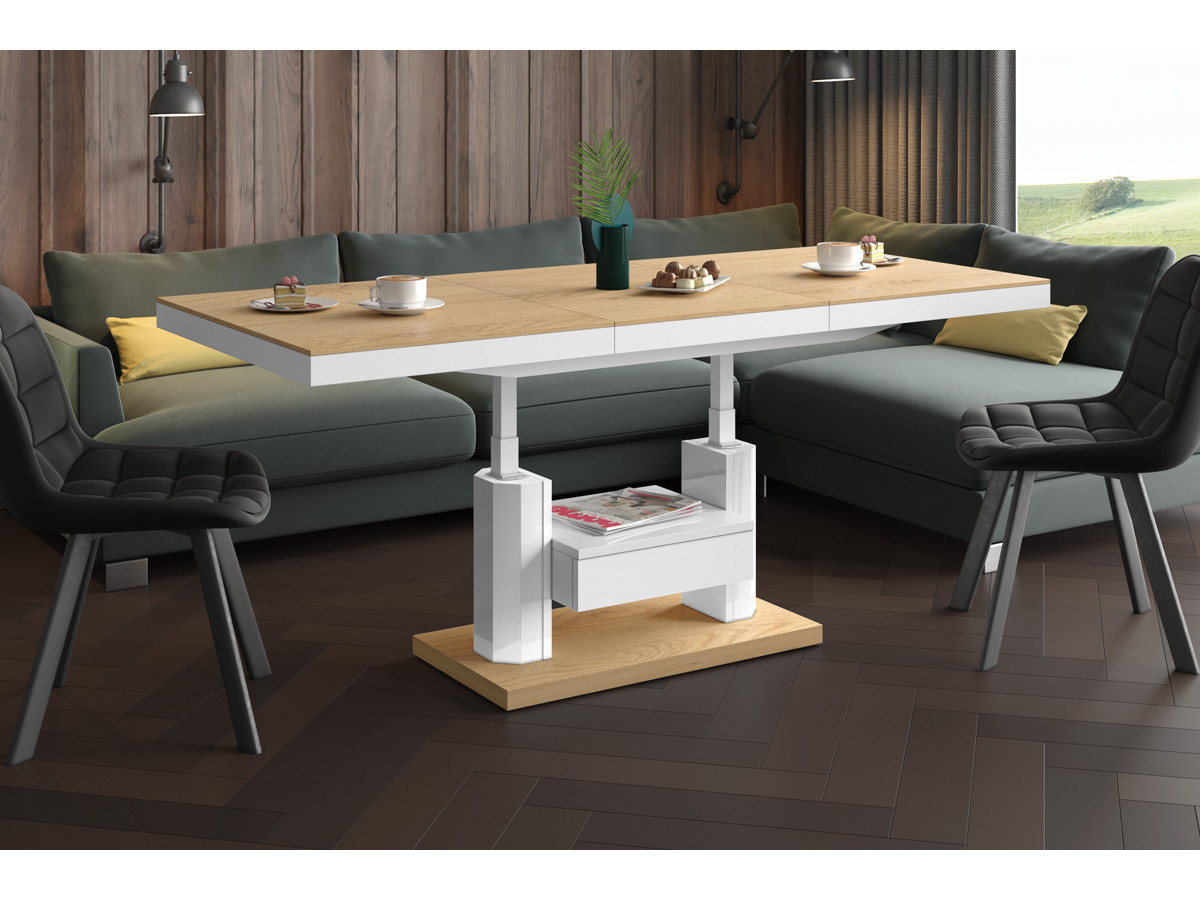 QUADRO LUX je konferenčný stolík v novej verzii. Stolík je v ponuke nielen vo vysokom lesku, ale odteraz ponúkame ten istý model aj s matným povrchom. Elegantná kombinácia matného a lesku bude esteticky dotvárať každý interiér. Tento model, okrem moderného prevedenia, sa vyznačuje vysokou funkčnosťou. Z bežného konferenčného stolíka môžete urobiť jedálensky stôl v plnej veľkosti behom niekoľkých sekúnd. QUADRO Lux sa dvíha od 56 cm až po 75 cm. Štandardnú dĺžku stola 120 cm je možné zväčšiť vložením dielu, ktorý je schovaný pod vrchnou doskou a tým zväčšiť dĺžku o 50 cm na 170cm.