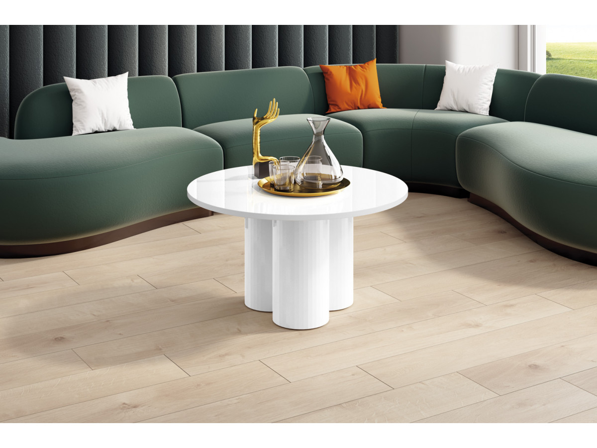 Konferenčný stolík RAVEO MINI je jedinečný kus nábytku, ktorý priťahuje pozornosť svojím dizajnom. Vyznačuje sa najtrendovejšou okrúhlou doskou sezóny, ktorá symbolizuje eleganciu a harmóniu. Vrchná platňa je z kvalitnej MDF v matnom, vysokolesklom alebo drevodekore. Zaujímavým  prvkom a určujúcim znakom sú tri valcové  nohy s trendovou štruktúrou jemných pruhov na povrchu.