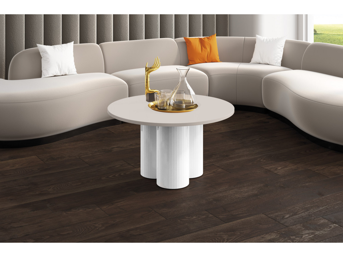 Konferenčný stolík RAVEO MINI je jedinečný kus nábytku, ktorý priťahuje pozornosť svojím dizajnom. Vyznačuje sa najtrendovejšou okrúhlou doskou sezóny, ktorá symbolizuje eleganciu a harmóniu. Vrchná platňa je z kvalitnej MDF v matnom, vysokolesklom alebo drevodekore. Zaujímavým prvkom a určujúcim znakom sú tri valcové nohy s trendovou štruktúrou jemných pruhov na povrchu.